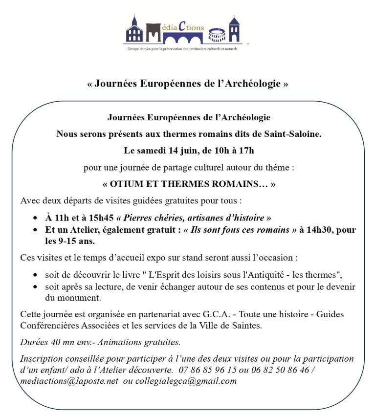 Nous le présenterons lors des "Journées Européennes de l’ Archéologie", car nous serons présents le samedi 14 juin 2025 sur le site des thermes dits de Saint-Saloine, avec un stand accueil et l’organisation de visites guidées gratuites. Cette journée-là, un atelier pour enfants sera tout spécialement organisé.( renseignements et détails à la rubrique évènements).