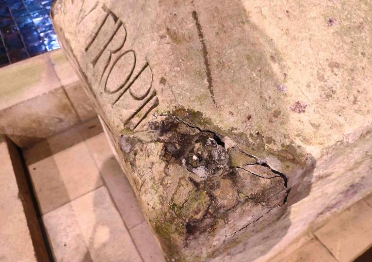 Le mois dernier, nous avons eu la bien mauvaise surprise de voir que le sarcophage de saint-Eutrope était endommagé; la pierre du couvercle étant fendue et des fragments s'effritant de plus en plus