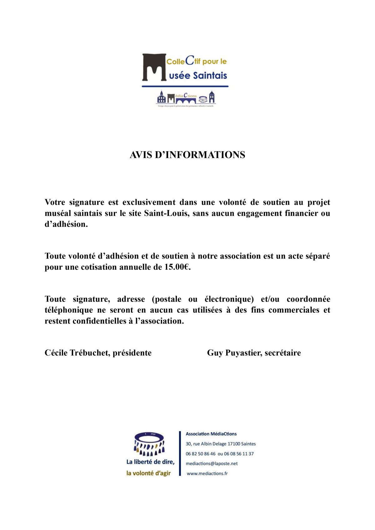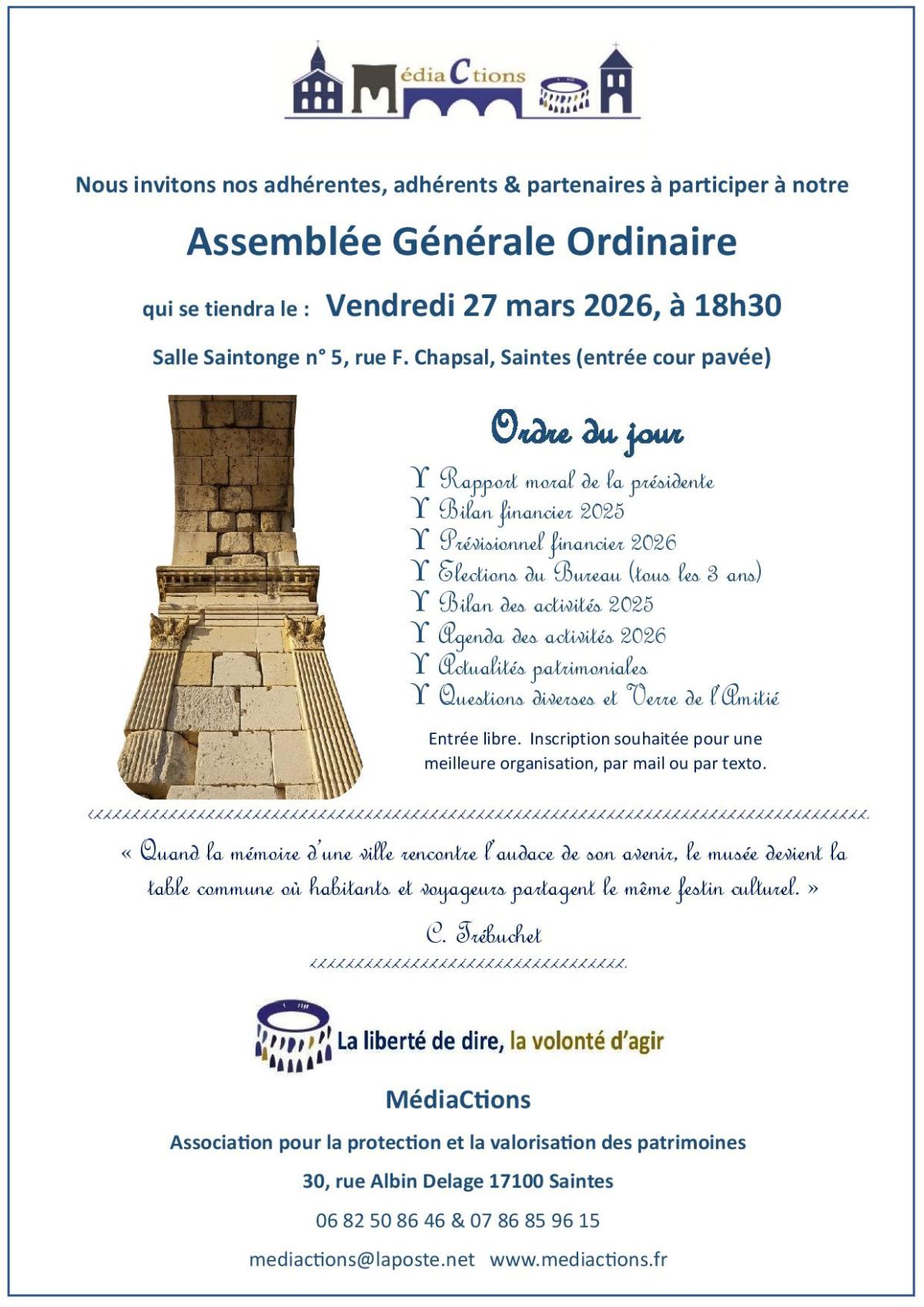 La Tribune des Patrimoines est créée par Médiactions en septembre 2019, elle se donne pour objectifs d’informer et d’alerter, en toute indépendance et objectivité, le citoyen saintais sur les patrimoines de notre région, dont certains sont soumis à des projets de restauration ou de transformation plus ou moins heureux. Ceci s’avère d’autant plus nécessaire lorsque la communication officielle est absente ou jugée trompeuse et manipulatrice.