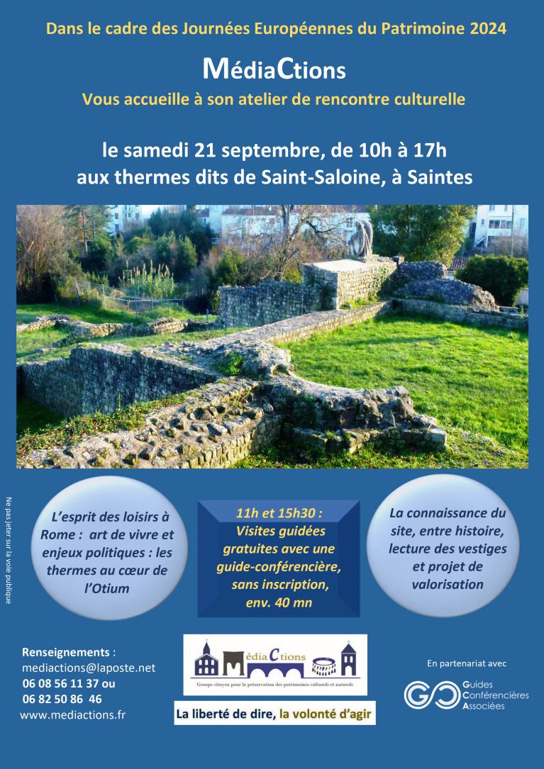 Dans le cadre des Journées Européennes du Patrimoine, MédiaCtions avait donné rendez-vous le samedi 16 septembre, de 10h30 à 13h et de 14h 17h30, aux thermes romains de Saintes dits de Saint-Saloine. Stand d’informations, exposition et départs de visites commentées à 11h et 15h par la conférencière en histoire de l’Art et des Patrimoines Cécile Trébuchet.
