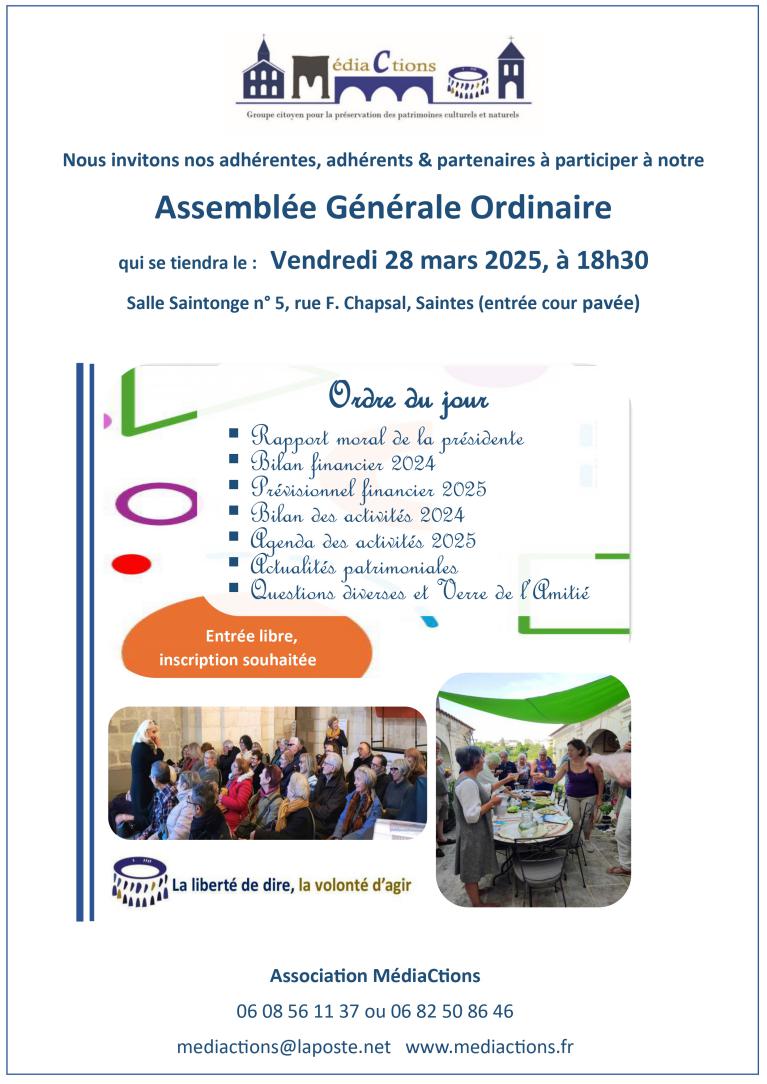 Au-delà de l’ordre du jour spécifique à cette réunion annuelle, celle-ci sera aussi l’occasion de faire un point sur nos activités ainsi que les projets et enjeux patrimoniaux pour Saintes et son territoire.
