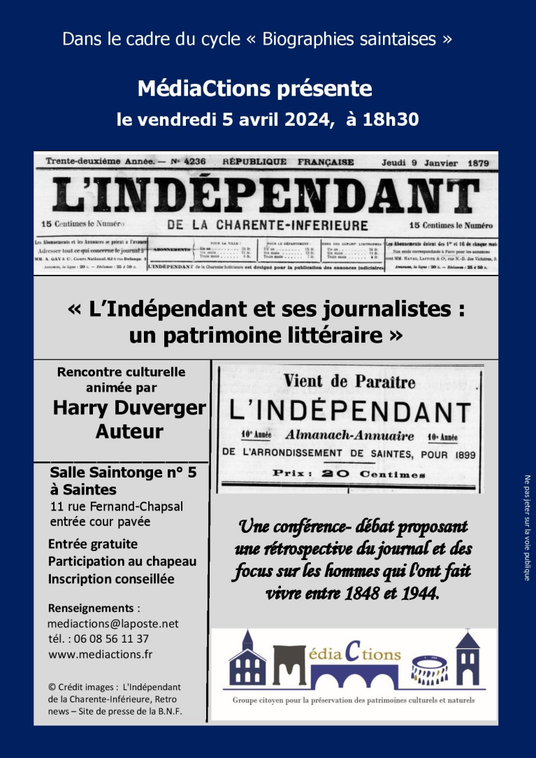 Nous avons le plaisir de vous informer que, dans le cadre de son cycle sur les « biographies saintaises », MédiaCtions propose une rencontre culturelle, animée par Harry Duverger, auteur, qui se tiendra le :