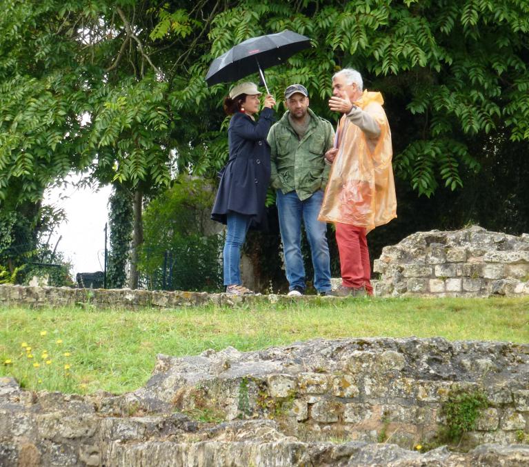 Images de Joëlle Nübold, guide conférencière et membre de MédiaCtions, de Guy Puyastier, secrétaire de l'association, n'hésitant pas à donner des explications malgré la pluie.