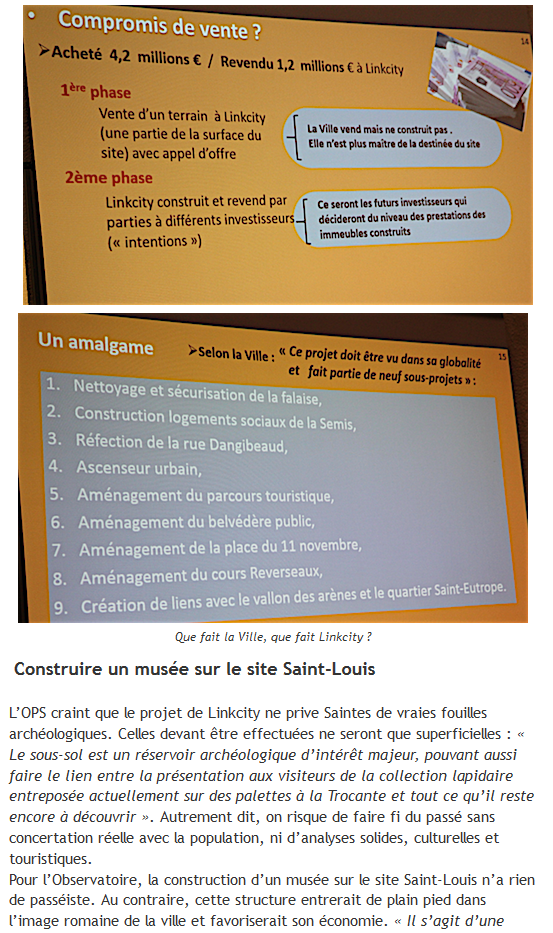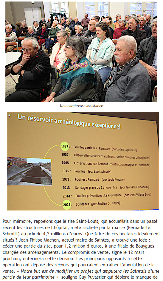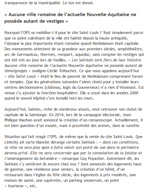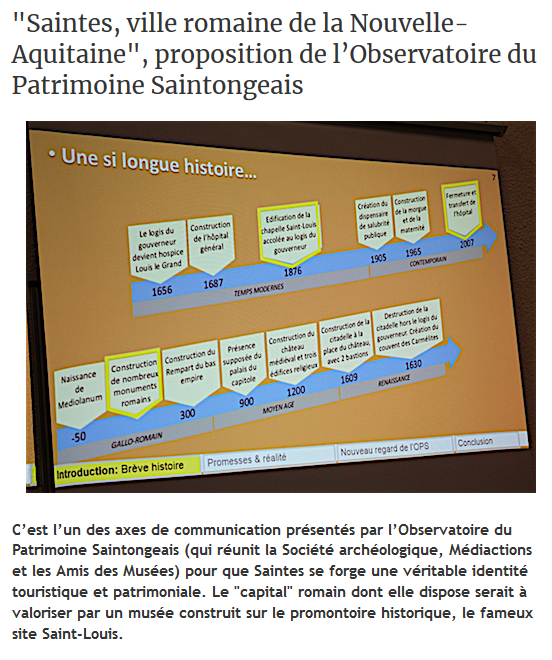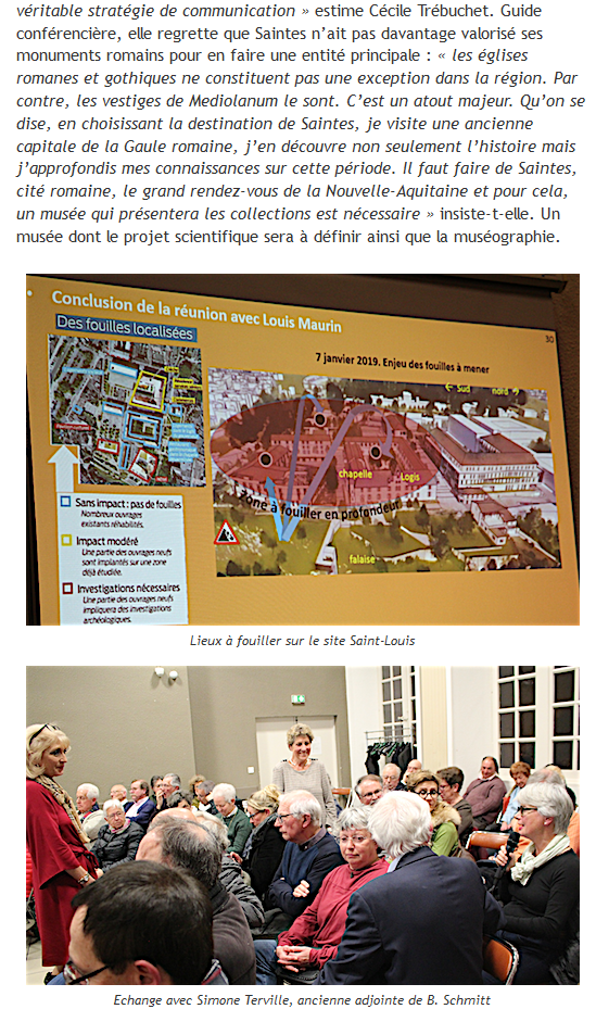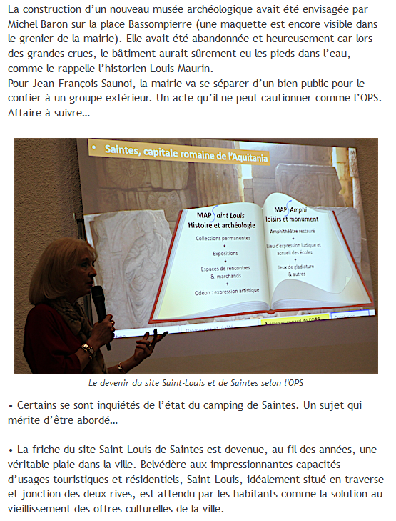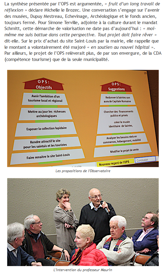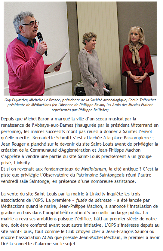 C'est au sein de l'Observatoire du Patrimoine de Saintonge que MédiaCtions travaille à la volonté de modifier le projet du Site Saint Louis. Après avoir présenté nos observations vendredi 1er mars en conférence-débat, nous rencontrons les élus et les acteurs du projet, afin de faire valoir nos propositions. Nos trois associations (La Société d'archéologie, Les Amis des Musées et MédiaCtions) unies depuis la création de l'OPS en 2018, donnent force et visibilité à une parole claire, argumentée et commune. Nous ne voulons pas seulement un musée sur le site Saint-Louis, nous le souhaitons aussi en véritable cohérence (sans vide à Saint Louis) sur le trajet touristique de l'ensemble de notre parure monumentale des deux rives. .. Mais encore...