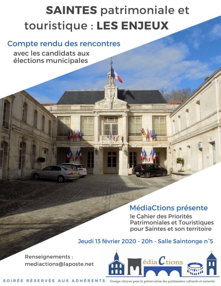 Merci à presque tous les candidats saintais – Nous vous donnons rendez-vous le 13 février 2020, pour la présentation des comptes rendus de nos rencontres avec les candidats et la présentation du Cahier des Priorités Patrimoniales et Touristiques de Saintes et son territoire.